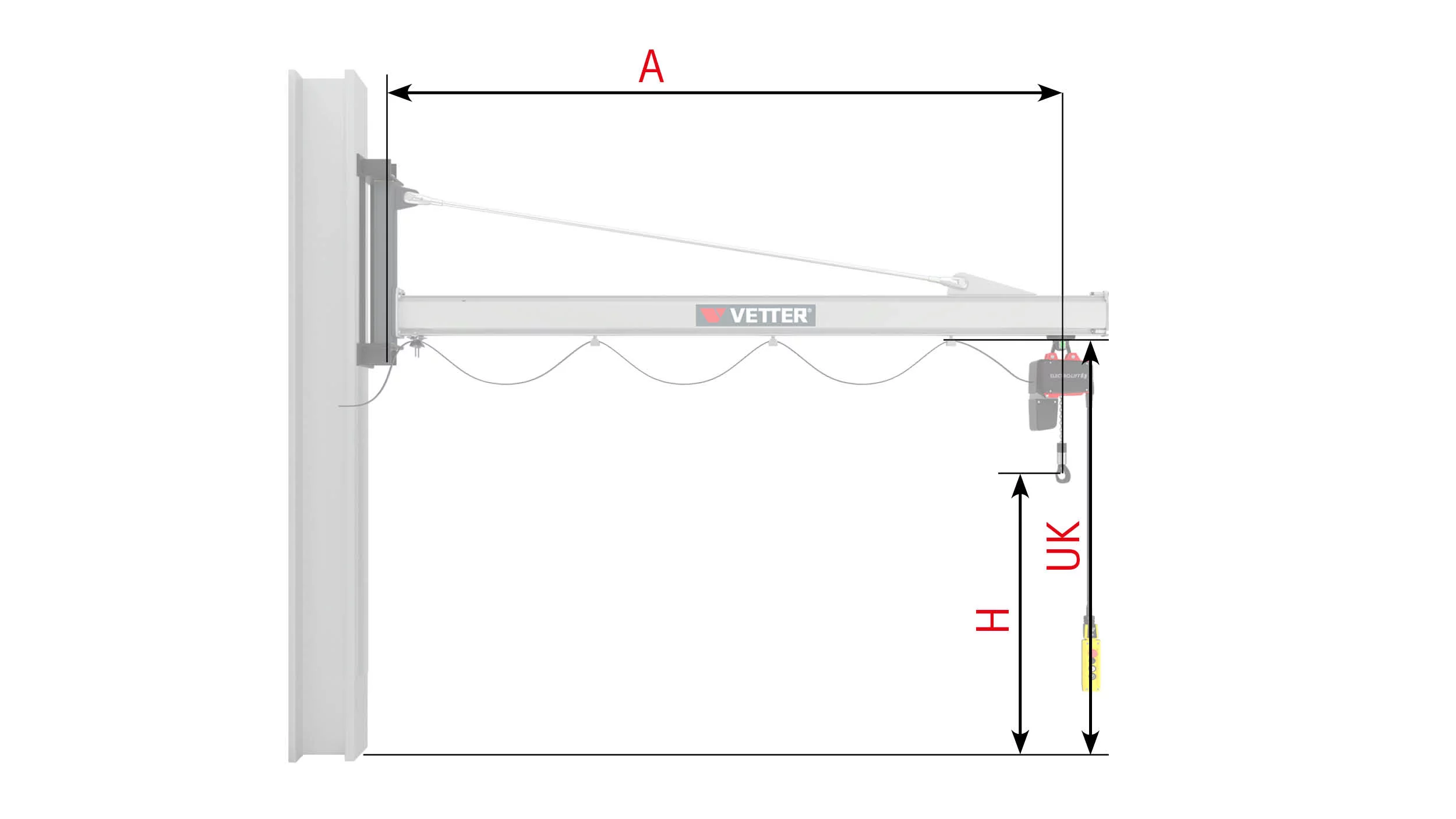 Skizze mit einer detaillierten Zeichnung eines Säulenschwenkrans US, auf der verschiedene Längenmaße benannt sind.