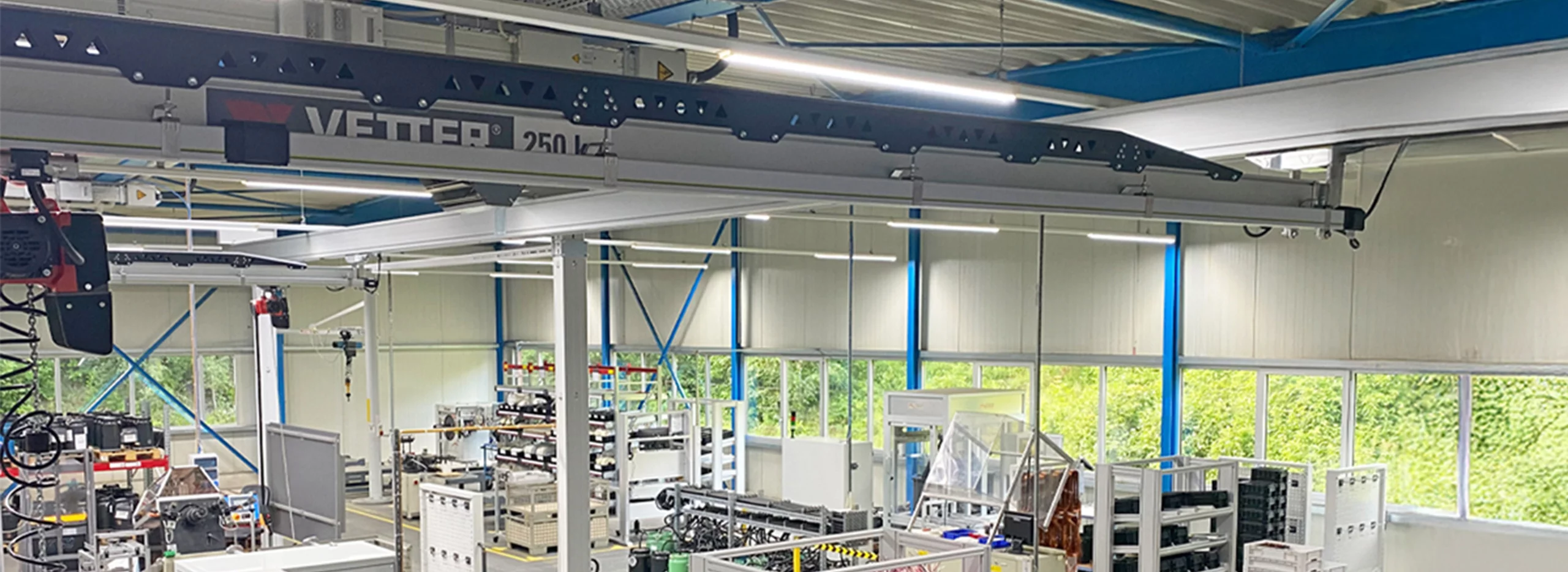 KEB Automation is one of the leading international suppliers of drive and automation technology. For KEB Antriebstechnik in Schneeberg, part of the KEB Group, crane solutions from VETTER are now an integral part of the production strategy, contributing significantly to reducing throughput times in manufacturing. Each crane type is individually tailored to component diversity, load capacity and handling requirements.