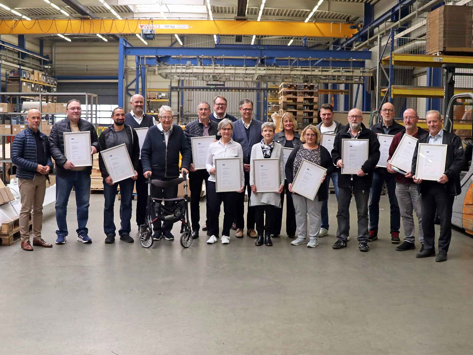 Dans une ambiance festive et chaleureuse, 14 de nos 26 jubilaires ont été personnellement honorés cette année pour leur ancienneté particulièrement longue. Avec 7 × 25 ans, 4 × 35 ans et 3 × 40 ans, nous avons célébré ces remarquables anniversaires de travail. La direction et le président du comité d'entreprise ont rendu hommage à cette performance remarquable lors d'une cérémonie.